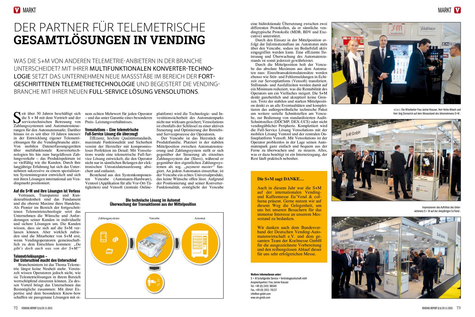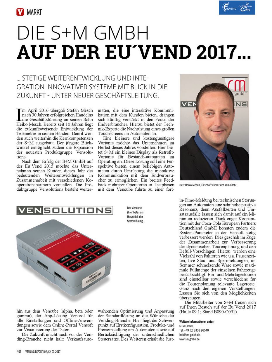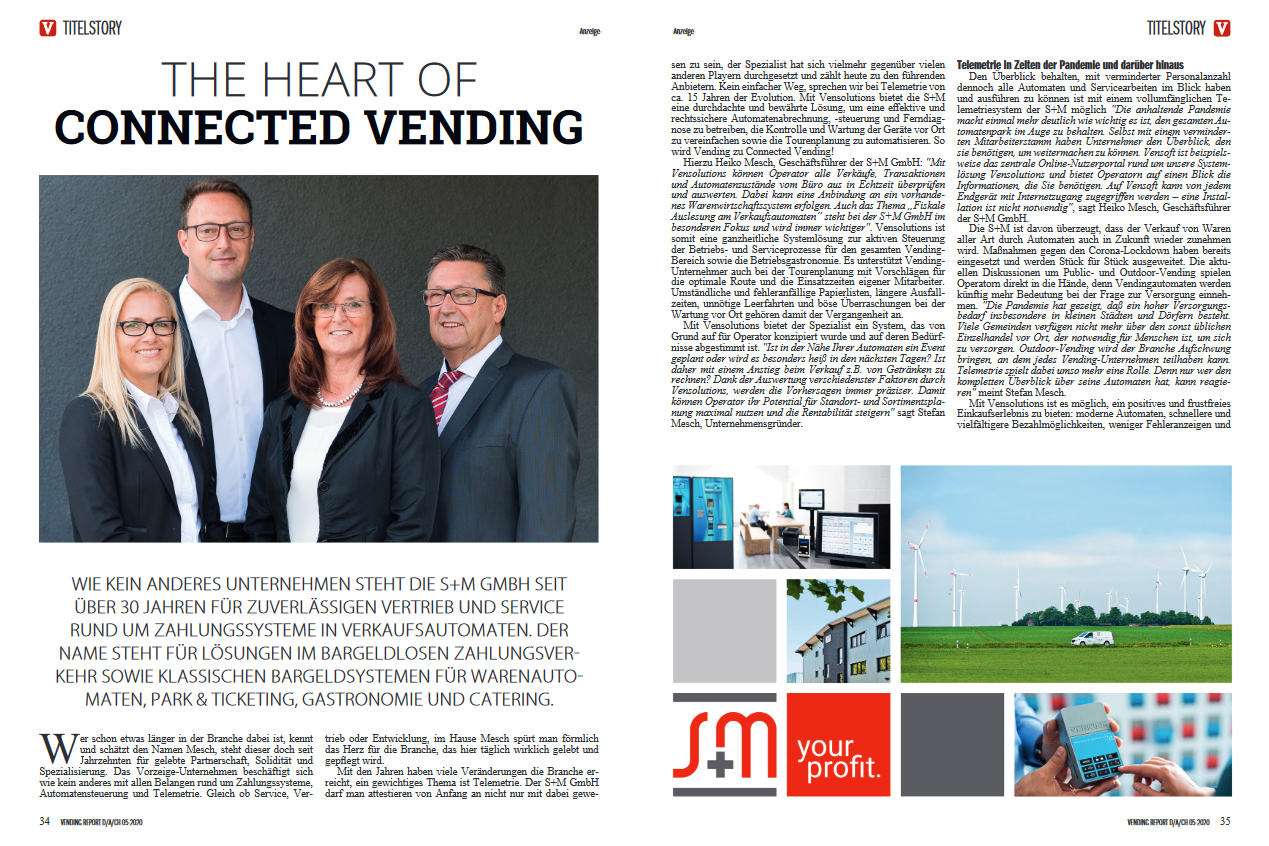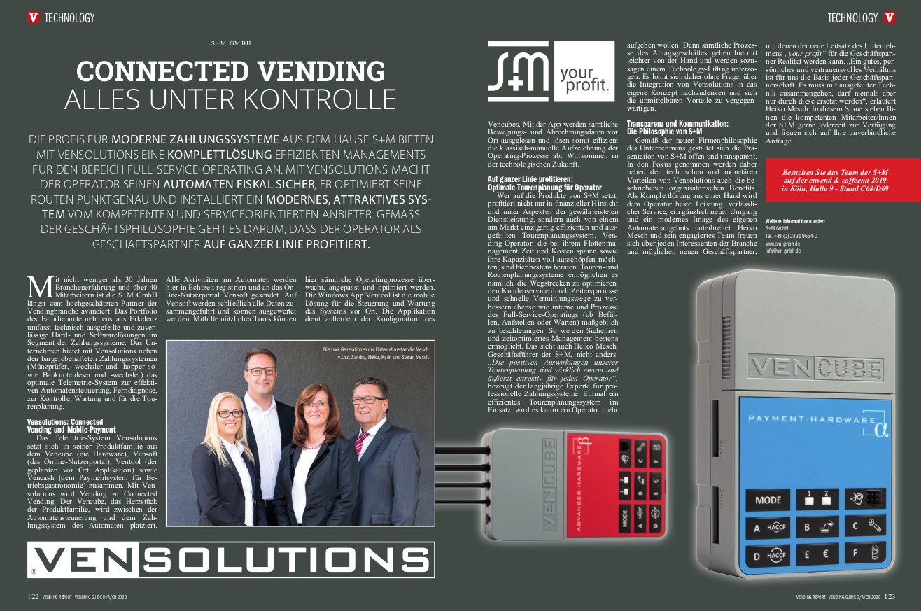 This cover story gives attention to the S+M GmbH as an established name in the vending industry and shows in detail the Vensolutions telemetry solution with all its advantages.
